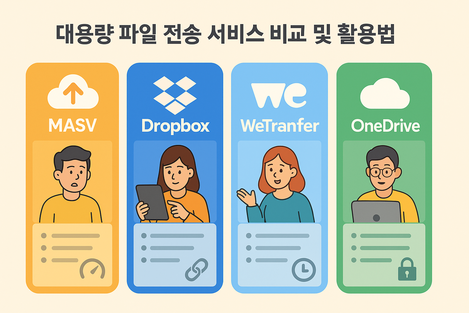 - 1회성 간단 전송은 WeTransfer, 파일키위 / 업무용은 Dropbox, MASV 추천